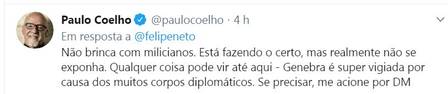 Paulo Coelho disse ainda que Felipe Neto poderia ir para Genebra, na Suíça, onde mora o escritor, numa mensagem direcionada ao youtuber: “Não brinca com milicianos. Está fazendo o certo, mas realmente não se exponha. Qualquer coisa pode vir até aqui – Genebra é super vigiada por causa dos muitos corpos diplomáticos. Se precisar, me acione por DM”.