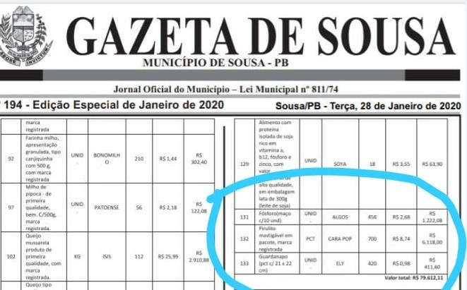 O prefeito de Sousa, Fábio Tyrone, gastou escandolosos R$ 6 mil na compra de pirulitos. Isso mesmo. Pelo menos é o que aponta a edição do dia último dia 28 do jornal oficial do município, o Gazeta de Sousa.