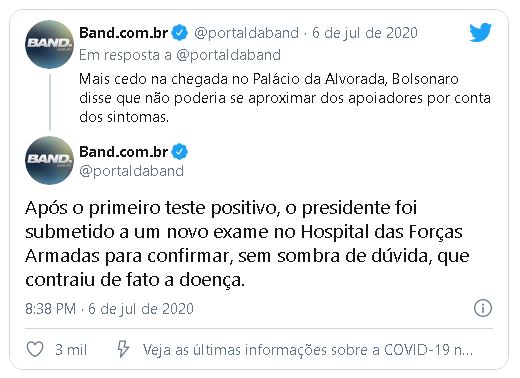 PEGOU OU NÃO? Band publica matéria confirmando contaminação de Bolsonaro por COVID-19