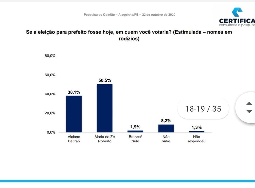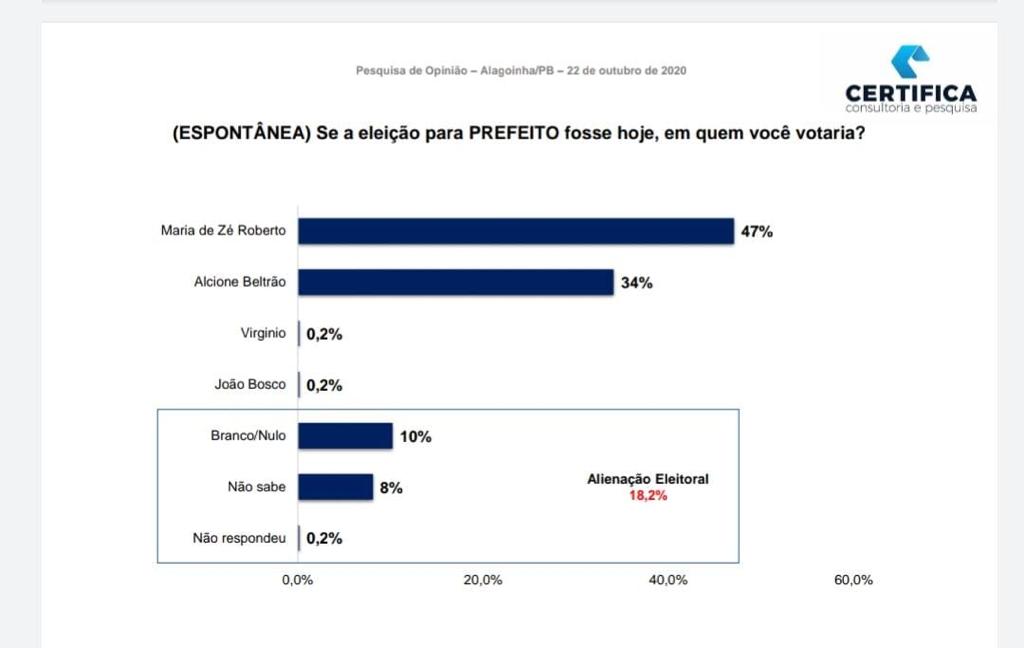 De acordo com os números apresentados, a população de Alagoinha já definiu o nome para os próximos quatro anos. Na pesquisa espôntanea, a candidata e atual prefeita, Maria de Zé Roberto (PSDB) acumula 47% das intenções de voto. A ex-prefeita, Alcione Beltrão (CIDADANIA) tem 34%.