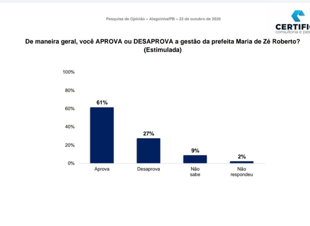 Na pesquisa estimulada, Maria de Zé Roberto também mantém uma boa distância na dianteira, com 50,5% das intenções de voto. Alcione Beltrão tem 38,1%.
