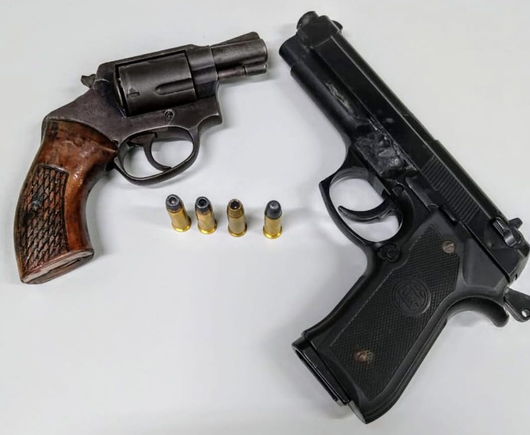 Ao serem abordados e revistados, foi encontrado com o primeiro, um revólver cal. 38 com quatro munições originais, com o segundo um simulacro de pistola, e com o terceiro não foi localizado nenhum ilícito, tendo sido o mesmo liberado pela delegada na Central de Polícia.