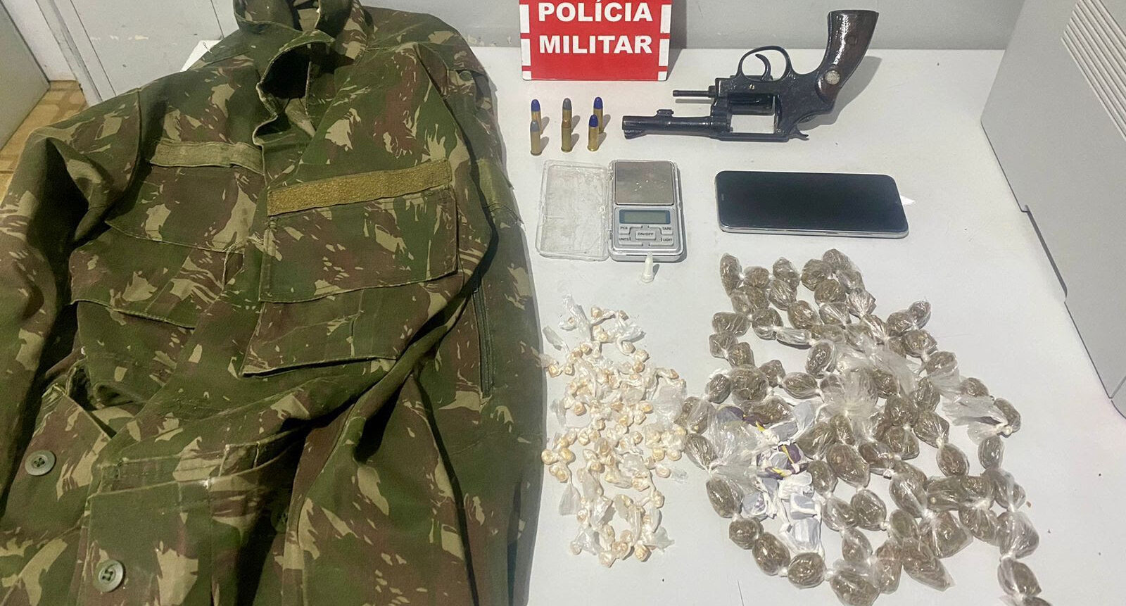 No momento em que as viaturas montaram um cerco no quarteirão, um homem avistou os policiais e empreendeu fuga para dentro de um imóvel, tentando pular o muro do quintal, mas foi alcançado e detido. Com ele, foi apreendido um revólver calibre 38 com seis munições. Um segundo suspeito encontrado no local também foi preso. Ele estava com 82 porções de maconha, 100 pedras de crack, uma balança de precisão e uma jaqueta camuflada.