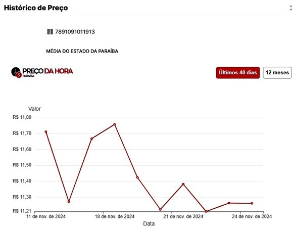 Além da vantagem do comparativo de preço do mesmo produto e marca comercializados nos diversos estabelecimentos paraibanos, o Preço da Hora disponibiliza o “Histórico de Preço” dos últimos 40 dias ou 12 meses. Contudo, esse serviço de “Histórico de Preço” somente pode ser acessado direto no portal https://precodahora.