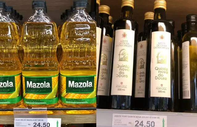 É bem verdade que em alguns casos existem diferenças nos volumes comparados. No caso do óleo de milho, a garrafa é de 900 mililitros e no azeite, de 500 mililitros. Também a embalagem do bacalhau congelado é de 800 gramas, e a carne bovina é vendida por quilo.
