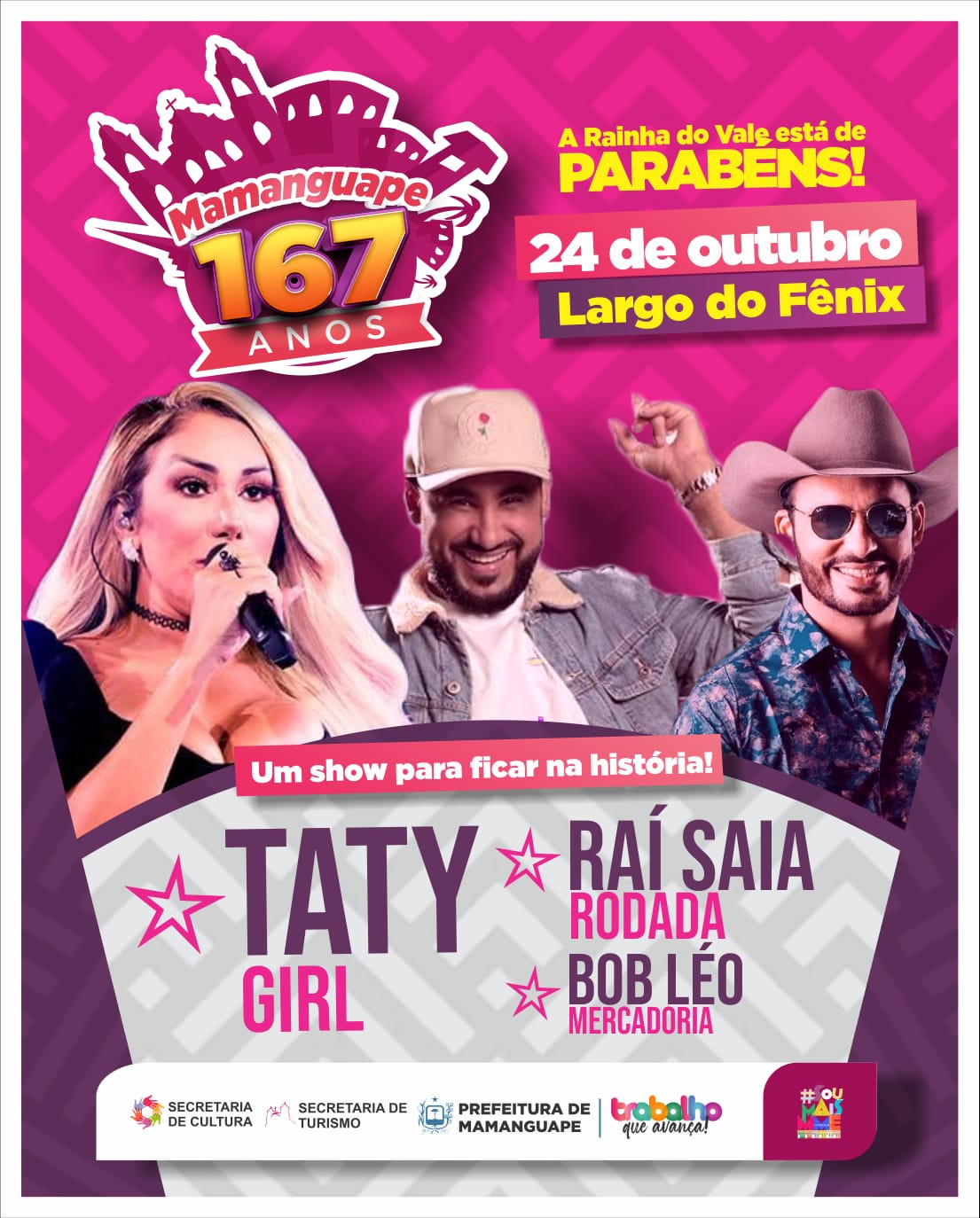 Atrações: Raí Saia Rodada, Bob Léo Mercadoria e Taty Girl