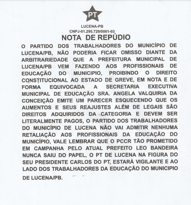 O Partido dos Trabalhadores (PT) da Paraíba se posicionou contra a decisão da prefeitura. Leia a nota: