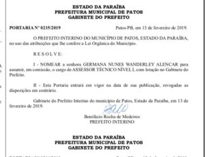 O semanário do município traz a nomeação de Germana Nunes, esposa do deputado estadual, Dr. Érico e da irmã do vereador, Diogo Medeiros. O que chama a atenção, é o salário da irmã do vereador Diogo, Raquel Medeiros, que passa de R$ 6 mil, conforme o sagres.