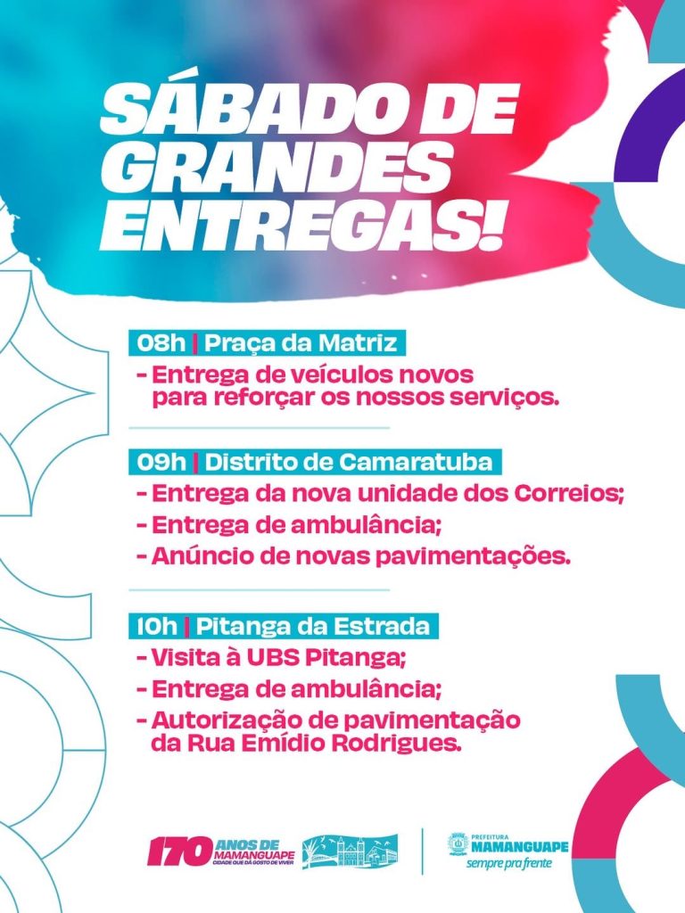 O Prefeito Joaquim Fernandes convida a população para participar de uma manhã especial neste sábado(25), em comemoração aos 170 anos de Mamanguape, com ações que vão fortalecer os serviços e a infraestrutura do município.