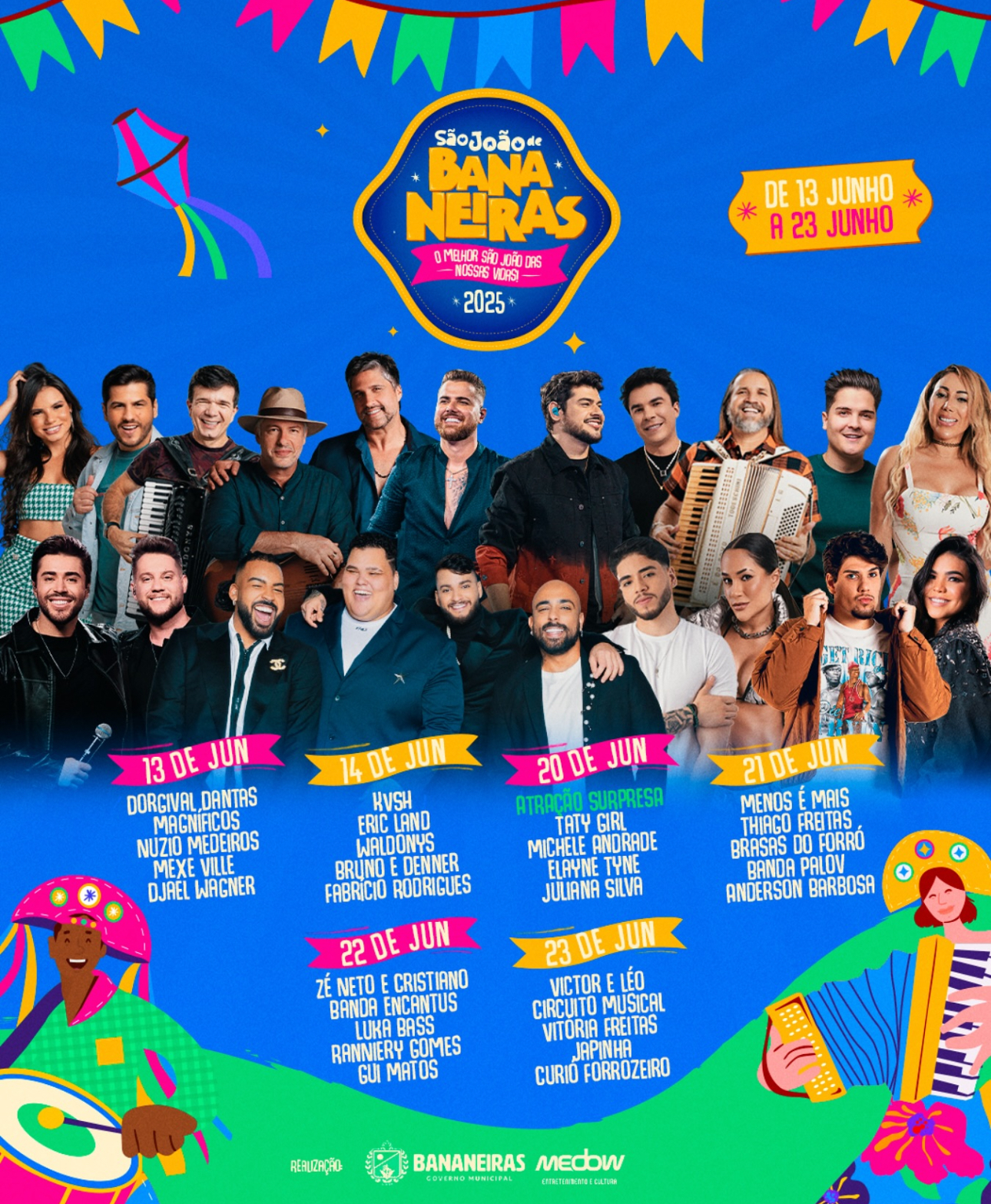 A programação do São João de Bananeiras, no Brejo da Paraíba, foi divulgada na noite desta sexta-feira (21) . A edição de 2025 acontecerá nos dias 13, 14, 20, 21, 22 e 23 de junho, com nomes como Zé Neto e Cristiano, Dorgival Dantas, Taty Girl e mais.