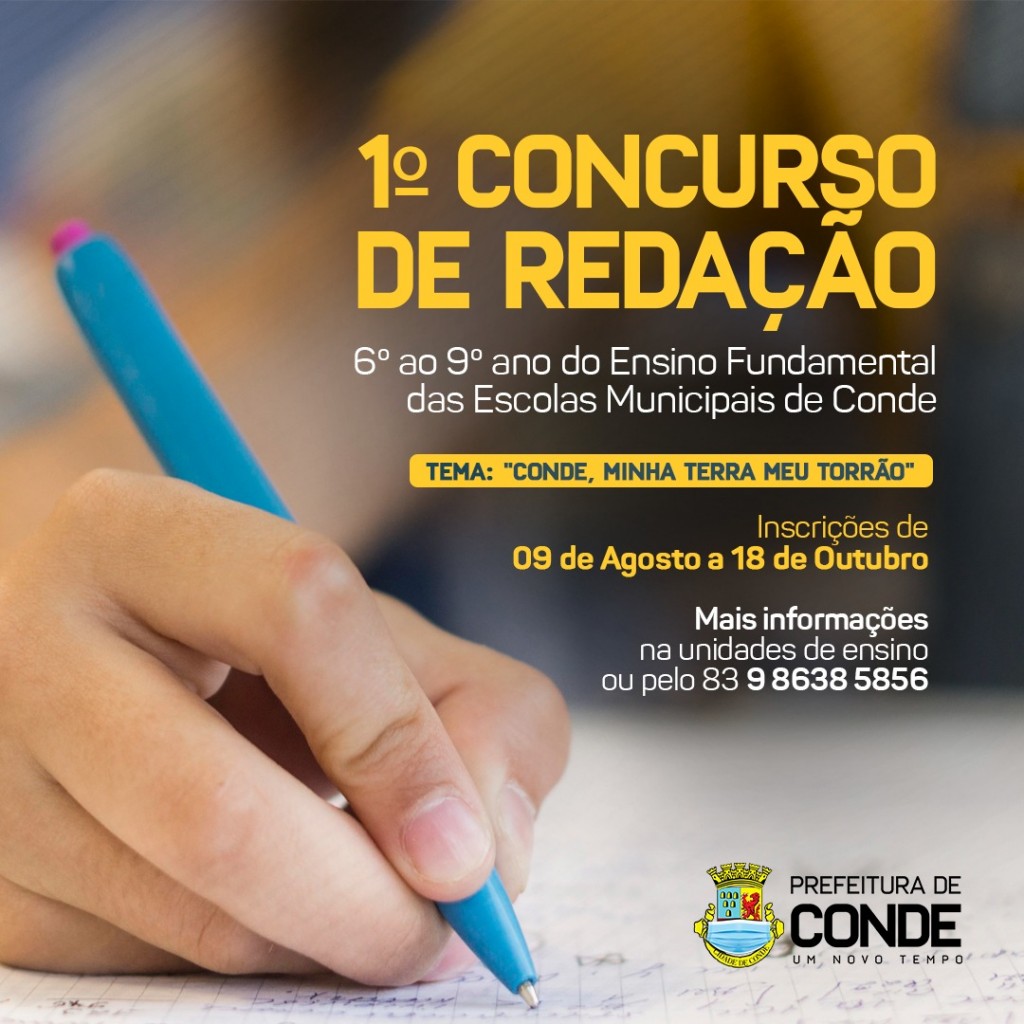 A Prefeitura de Conde, por meio da Secretaria de Educação, Cultura e Esporte (Semec), está realizando o 1º Concurso de Redação para alunos da rede pública municipal de ensino, devidamente matriculados e com frequência regular. O objetivo é homenagear a cidade que completa 58 anos dia 18 de novembro.