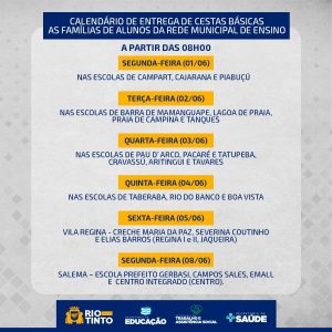 Assim como o prefeito lembra em sua mensagem a Prefeitura Municipal de Rio tinto já anunciou o calendário oficial de distribuição das cestas básicas com os dias e os horários em que as cestas serão distribuídas em cada escola. Qualquer dúvida referente à distribuição poderá ser sanada através do contato com a Secretaria Municipal de Educação através do número: (83) 98634-3003.