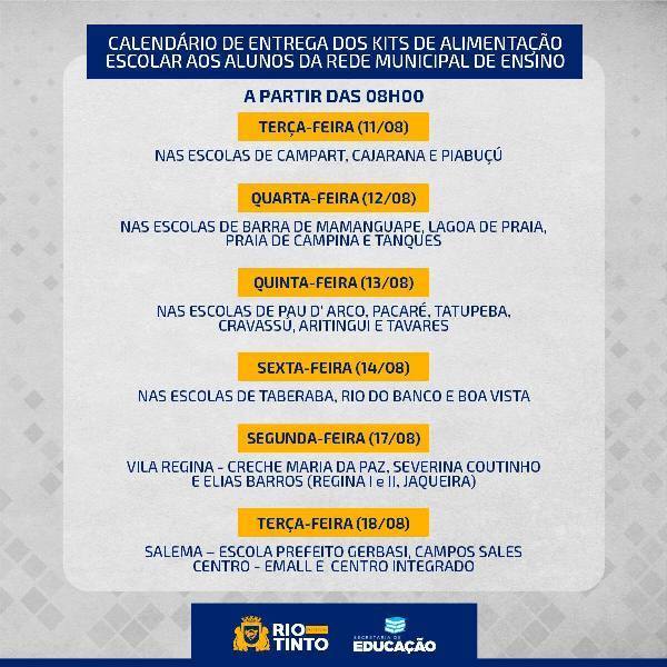 A Secretaria de Educação de Rio Tinto, divulgou o calendário de entrega da 2ª etapa dos kit´s de alimentos, para as famílias de alunos que estão matriculados na rede municipal de ensino.