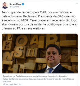 Pelo Twitter, o ministro da Justiça, Sérgio Moro, respondeu ao presidente da OAB. Moro foi alvo de críticas de Felipe Santa Cruz, que alegou não ter acesso ao Ministério da Justiça. “Tenho grande respeito pela OAB, por sua história, e pela advocacia. Reclama o Presidente da OAB que não é recebido no MJSP. Terei prazer em recebê-lo tão logo abandone a postura de militante político-partidário e as ofensas ao presidente e a seus eleitores”, escreveu o ministro.