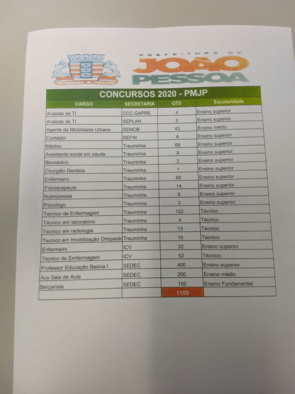 Segundo o prefeito, será priorizado as áreas da educação e saúde, sendo 700 vagas para educação priorizando a educação infantil. Na área da saúde são 399 vagas para Maternidade Cândida Vargas e no Ortotrauma de Mangabeira. O concurso ainda oferecerá vagas para área da mobilidade urbana, tecnológica da informação e contabilidade. A expectativa é que os aprovados neste concurso sejam convocados até novembro de 2020.