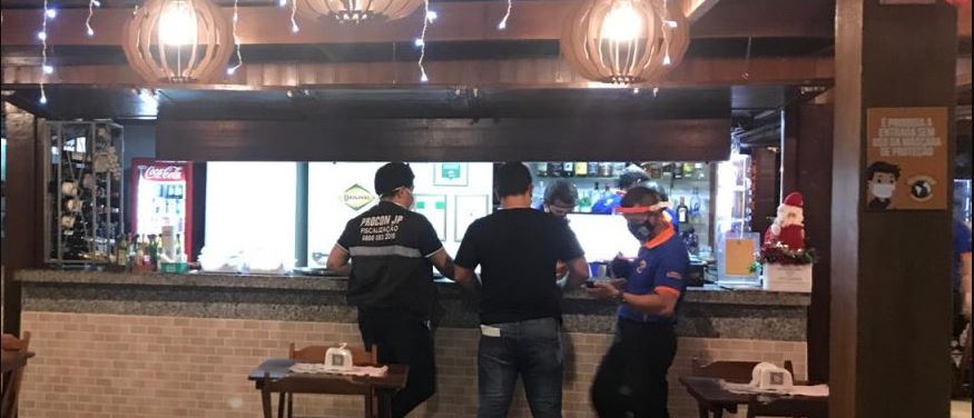 Em relação aos bares, a fiscalização do Procon-JP está inspecionando o cumprimento da legislação no que se refere à prevenção ao Coronavírus. Estão sendo verificadas questões como o uso de máscaras por parte de clientes e funcionários, distanciamento das mesas, capacidade máxima do local (aglomeração principalmente em locais com música ao vivo) e o horário de funcionamento.
