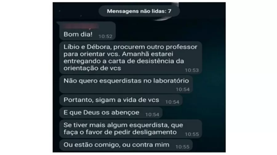 “Procurem outro professor para orientar vocês. Amanhã estarei entregando a carta de desistência da orientação de vocês. Não quero esquerdistas no laboratório. Portanto, sigam a vida de vocês, e que Deus os abençoe”, escreveu a docente.