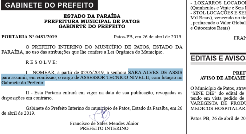 O prefeito interino Sales Júnior (PRB) decidiu nomear a senhora Sara Alves de Assis, esposa do vereador Suélio Caetano (PTN), para assumir o cargo comissionado como assessor técnico nível II no gabinete da Prefeitura Municipal de Patos.