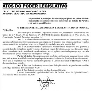 O presidente da Assembleia Legislativa da Paraíba, Adriano Galdino, publicou nesta quinta-feira (05) a Lei 11.807 que proíbe que se cobre ao cliente algum tipo de valor adicional pela perda do ticket de estacionamento de estabelecimentos comerciais por toda a Paraíba. A partir de agora estabelecimentos, que possuem área própria ou de terceiros que funciona como estacionamento, terão de possuir o registro de entrada e saída de veículos.