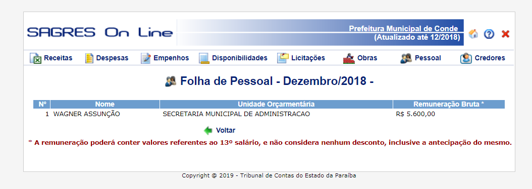 Ainda segundo os dados obtidos pela nossa redação, o servidor comissionado da prefeita de Conde, Marcia Lucena (PSB), recebeu o montante de R$ 95.420,00 em dois anos e meio.