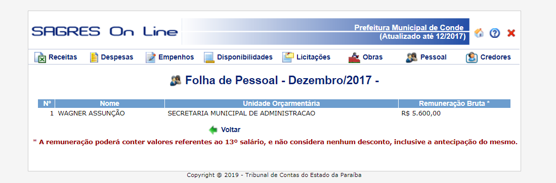 De acordo com o Sagres, sistema de controle de informações do Tribunal de Contas do Estado da Paraíba (TCE), Wagner Bezerra de Assunção foi admitido em 2017, no cargo de diretor de conteúdos da prefeitura. Ele é proprietário do portal Litoral Já e da Rádio J.A Conde PB, e usou o site para veicular matéria contra a pré-candidata do PSD que disputará a eleição em 2020 no Conde, Karla Pimentel.