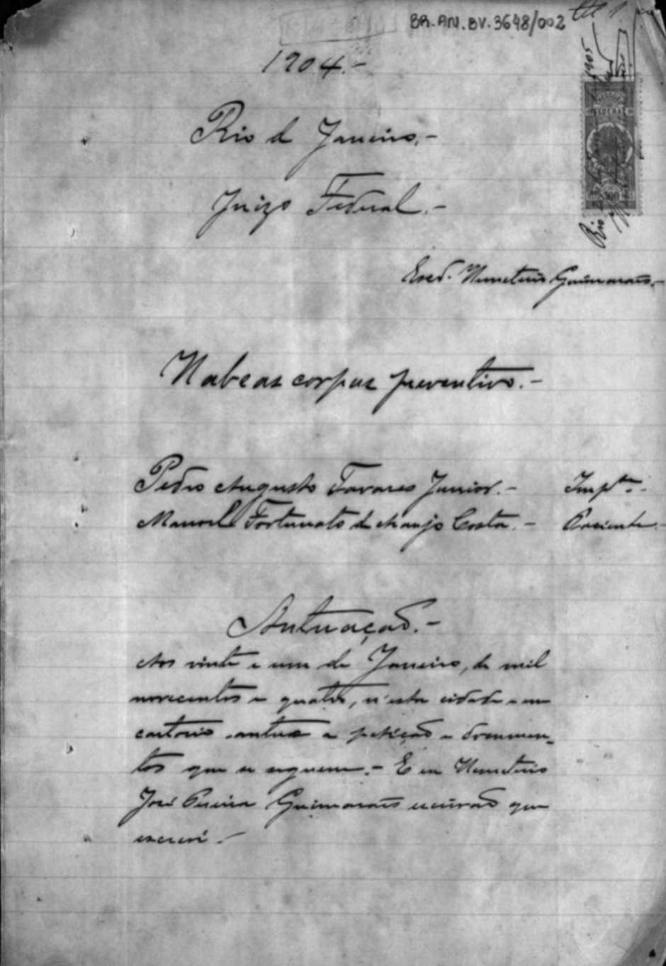 No início de 1905, chegou à Suprema Corte um habeas corpus apresentado em nome de Manoel Furtunato de Araujo Costa, que morava na Rua D. Eugênia, no bairro do Rio Comprido, na região central do Rio. Manoel era um português de nascimento que, nos tempos do Império, se naturalizou brasileiro para ajudar a propaganda republicana – “do que deve estar muito arrependido”, escreveu o seu advogado, na petição à mão enviada ao Supremo.