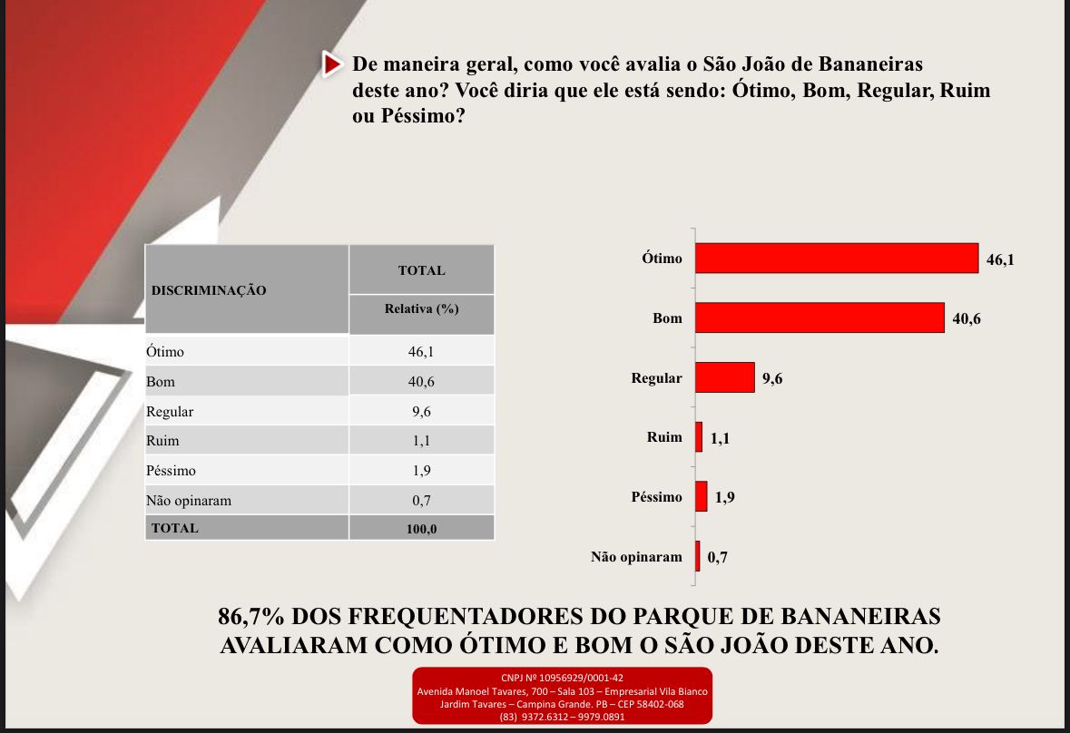 A pergunta que o instituto formulou para os entrevistados foi: “De maneira geral, como você avalia o São João de Bananeiras deste ano?”