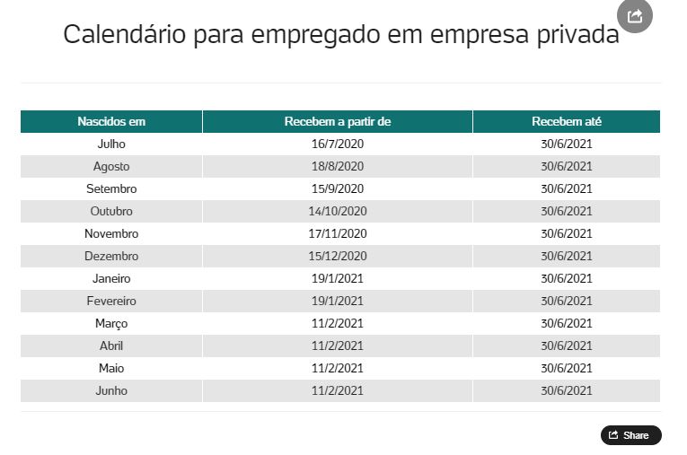 Veja como ficou o calendário de pagamento após a última resolução. O cronograma segue o mês de nascimento para empregados da iniciativa privada (PIS) e o número de inscrição do Pasep para funcionários públicos: