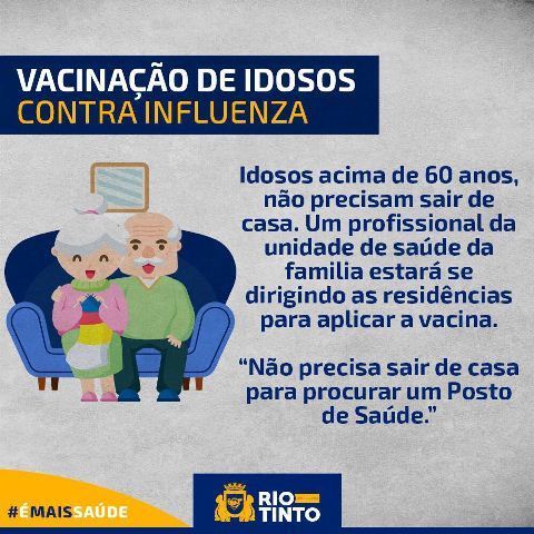 A Secretaria Municipal de Saúde da cidade de Rio Tinto comunicou que estará vacinando os idosos a partir de 60 anos, em suas residências, a partir desta segunda-feira (23), data de início da campanha nacional de imunização contra a gripe.