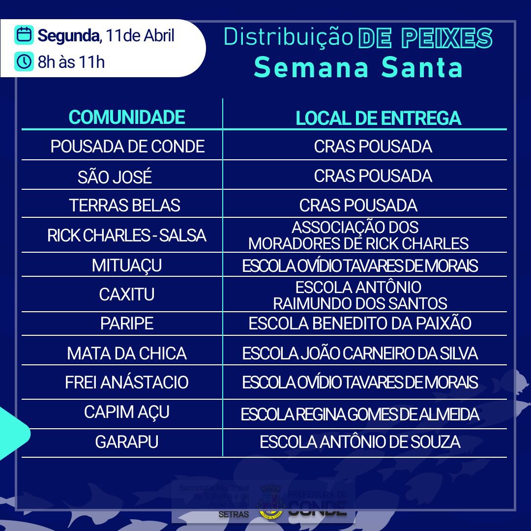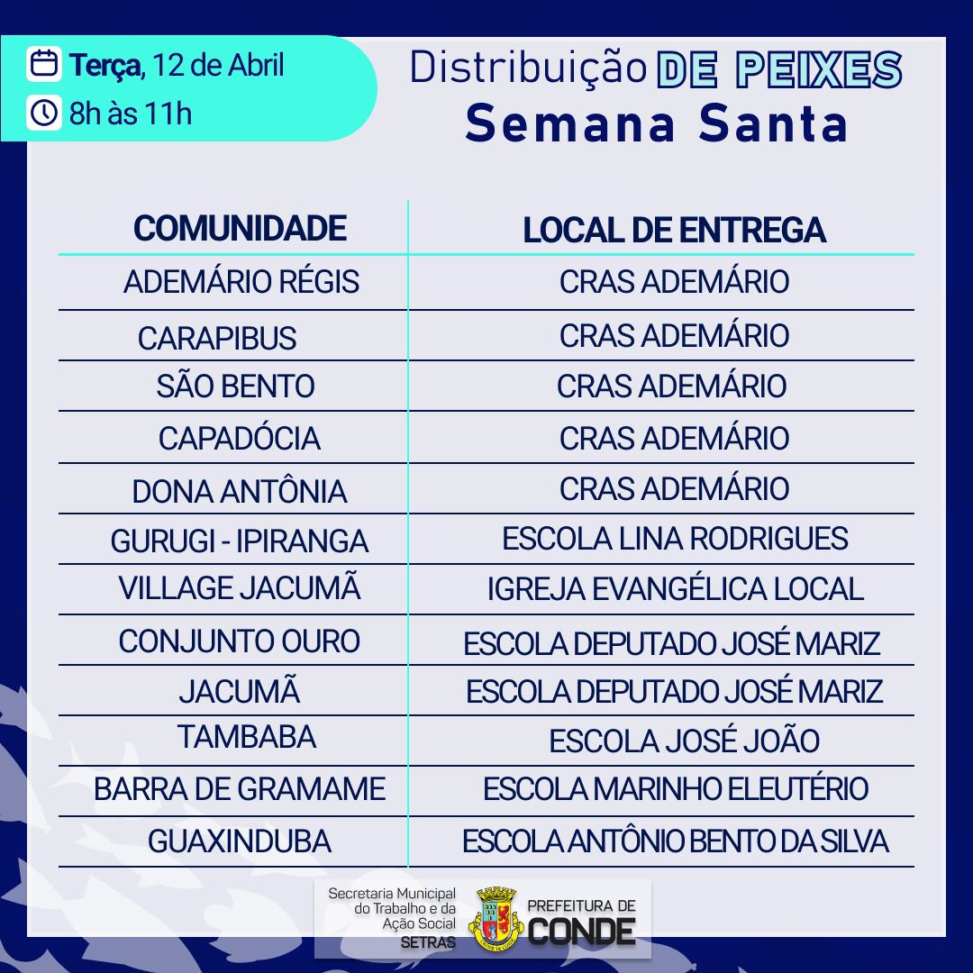 A Prefeitura de Conde inicia, nesta segunda-feira (11), a distribuição de 17 toneladas de peixe e 8.500 quilos de arroz. Foi elaborado um cronograma com os locais e datas para a entrega dos gêneros alimentícios. A ação será encerrada na quarta-feira (13).