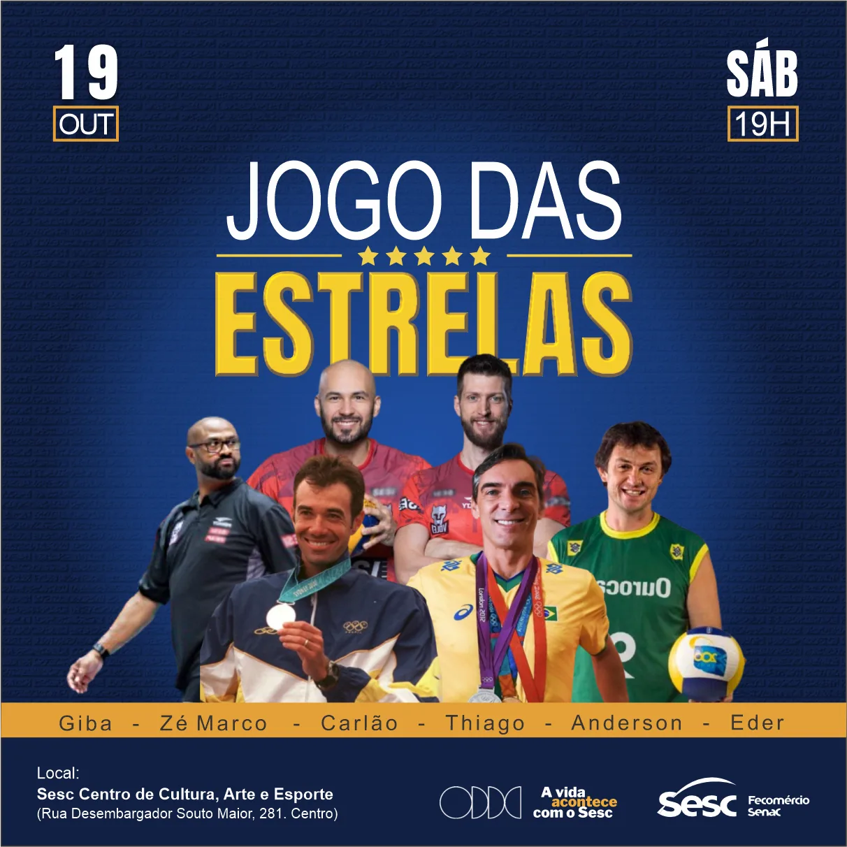 No dia 19 de outubro, às 19h, o Centro de Cultura, Arte e Esporte do Sesc em João Pessoa será palco do Jogo das Estrelas de Voleibol, reunindo grandes nomes da modalidade, como Giba, Zé Marco, Carlão, Thiago, Anderson e Eder. Os atletas enfrentarão a Seleção Paraibana Master e a Escola de Voleibol do Sesc.