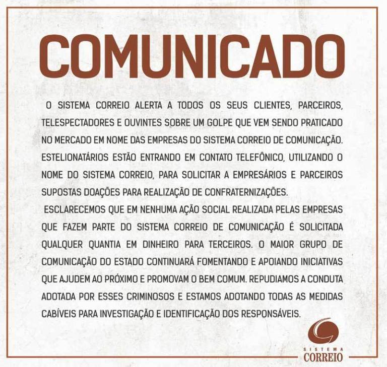 “Esclarecemos que em nenhuma ação social realizada pelas empresas que fazem parte do Sistema Correio de Comunicação é solicitada nenhuma quantia em dinheiro para terceiros. O maior grupo de Comunicação do Estado continuará fomentando a apoiando iniciativas que ajudem ao próximo e promovam o bem comum. Repudiamos a conduta adotada por estes criminosos e estamos adotando todas as medidas cabíveis para investigação e identificação dos responsáveis”, diz o comunicado.