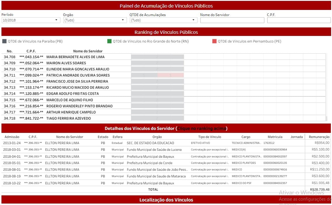 O painel, que é elaborado a partir de um levantamento de dados feito pelo TCE, destaca o levantamento dos meses de 2017 e os 10 primeiros meses de 2018, identificando a situação do servidor a cada mês de competência e apontando a quantidade de vínculos que cada um possui.