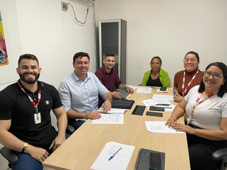 Durante a reunião realizada na ESPEP, nesta terça-feira (02), a Superintendente Ivanilda Matias, juntamente com Thamires Nunes, coordenadora do NUSET, Antônio Junior, assessor técnico e Ivanira Pontes, coordenadora do EAD da ESPEP, receberam Thiago Paiva, Subgerente e Pedro Henrique, Técnico Administrativo, ambos da SGFOR – Subgerência de Desenvolvimento e Formação de Profissionais – para discutir a capacitação dos servidores da educação do estado, com foco na inovação e tecnologia no processo formativo.