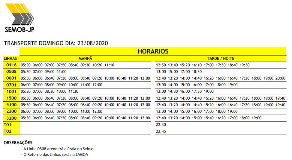 As linhas em circulação serão a 116, 508, 601, 701, 1001, 1500, 5100, 2300 e 3200, com retorno do Parque da Lagoa. A linha 508 também vai cobrir o bairro do Seixas. O quadro de horários pode ser visualizado abaixo.