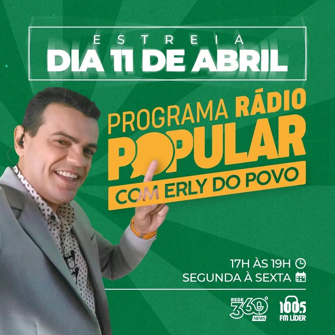 Erly Bergson Fernandes, quem vê assim pode estranhar o nome, mas Erly do Povo já é popular entre os paraibanos. A partir do dia 11, o comunicador estará ainda mais perto. No horário do rush, das 17h às 19h, Erly estará liderando a Rádio Popular da Rede 360 News e 100.5 Líder FM