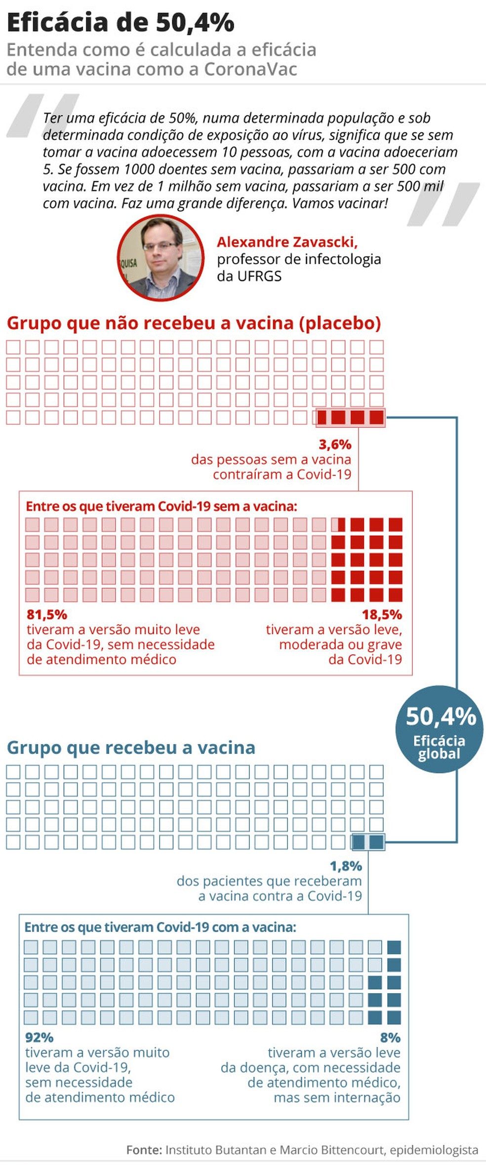 A CoronaVac, por exemplo, teve eficácia geral de 50,38%. (Entenda melhor neste link). Esse percentual está acima do mínimo estabelecido pela Anvisa para aprovação de uma vacina, que era de 50%.Veja o infográfico abaixo.