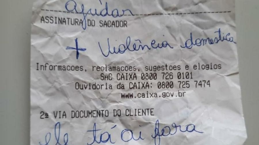 Segundo a Polícia Militar do Distrito Federal, a vítima aproveitou a ida a uma agência da Caixa Econômica Federal para sacar o benefício do Bolsa Família para fazer a denúncia. Em um pedaço de papel, ela escreveu “você pode me ajudar?”, e desenhou um X — que é o símbolo de pedido de socorro da campanha de combate à violência doméstica no DF.