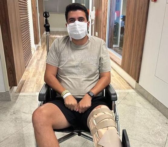 Na imagem, ele aparece sentado em uma cadeira de rodas e usando um imobilizador na perna esquerda. “E vamos melhorando, graças a Deus”, escreveu o deputado, na legenda.
