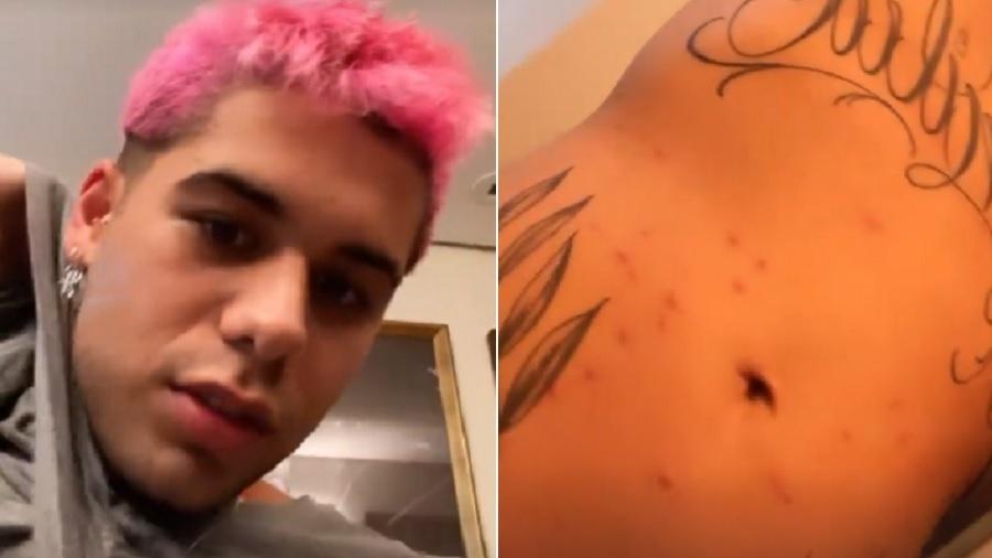 O cantor publicou vídeos nos stories, do Instagram, exibindo a barriga e as pernas com manchas vermelhas e revelou que até chegou a encontrar os pequenos aracnídeos mortos pelo corpo após tomar injeções para tratar da alergia.